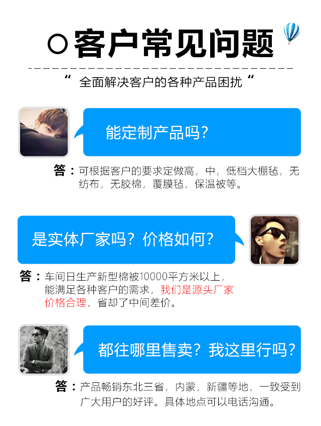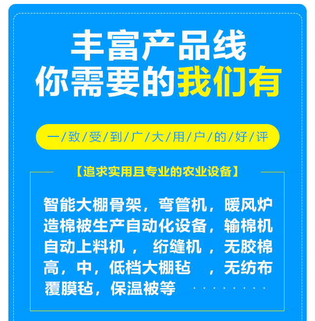 本公司設備齊全,可生產智能大棚骨架,彎管機,暖風爐等農業(yè)設備,另制造棉被生產自動化設備,自動上料機,輸棉機,絎縫機等。質量可靠,注重創(chuàng)新。公司擁有雄厚的實力,先進的生產線,豐富的經(jīng)驗,可根據(jù)客戶的要求定做高,中,低檔大棚氈,無紡布,無膠棉,覆膜氈,保溫被等,車間日生產新型棉被10000平方米以上,能滿足各種客戶的需求,新型保溫被產品在國內研發(fā)中始終保持在前列。